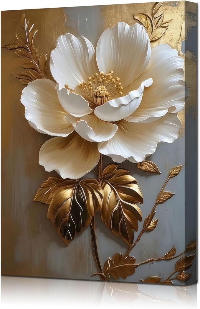 Flower Pictures Canvas Wall Art White Gold Flowers Elegant Wall Decor pictures 3D Retro Floral poster prints for Bedroom Bathroom Wall Decorations (12inx16in canvas)