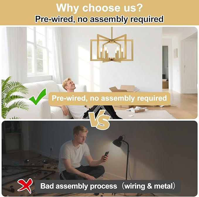 - 【No Assembly & Easy Installation】The lamp arms come pre-assembled—simply unfold them to complete the assembly of your gold chandelier, assembly is a breeze! Besides, the dining room light fixture comes with all the necessary parts and detailed instructions for hassle-free installation.