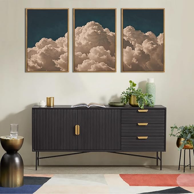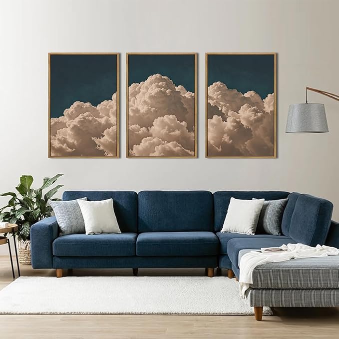 IARTTOP Large Cloud Canvas Wall Art Framed 16x24 Inch Navy Blue Cloud Painting Set of 3 Modern Abstract Sky Landscape Wall Decor For Living Room Bedroom Office