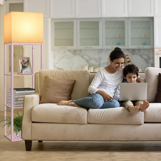 Dott Arts Floor Lamp with Shelves, Wide Floor Lamps for Living Room Display Shelf Lamps with 3 Color LED Bulb,Storage Wood Modern Floor Lamp for Bedroom Standing Lamp for Living Room Office(Pink)