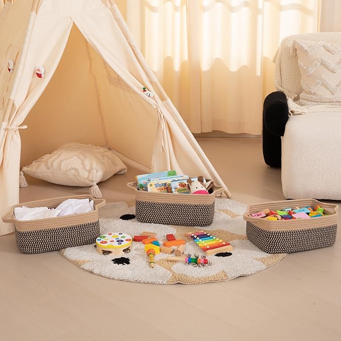 OIAHOMY 3 Pack Storage Baskets for Organizing, Woven Cotton Rope Basket for Shelves, Closet Organizer Bins with Handles, Rectangle Toy Organization, 13.78''×9.84''×5.5'', Brown & Black