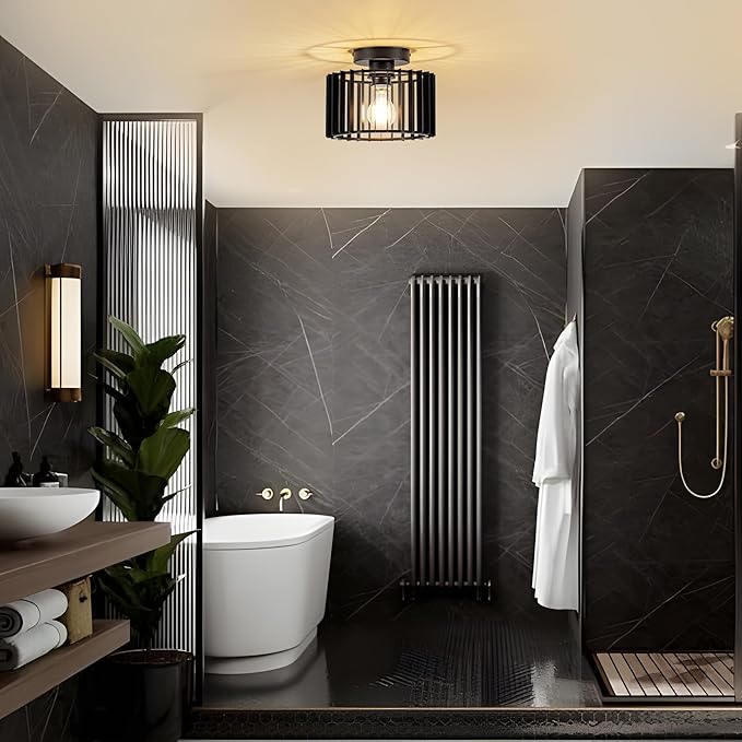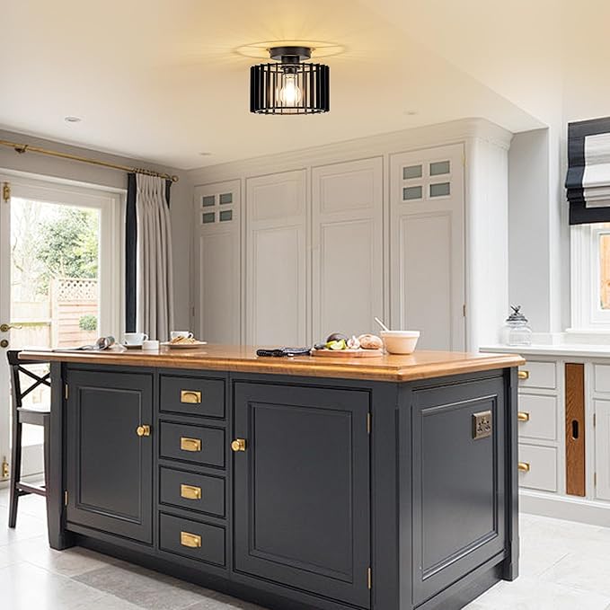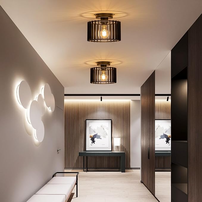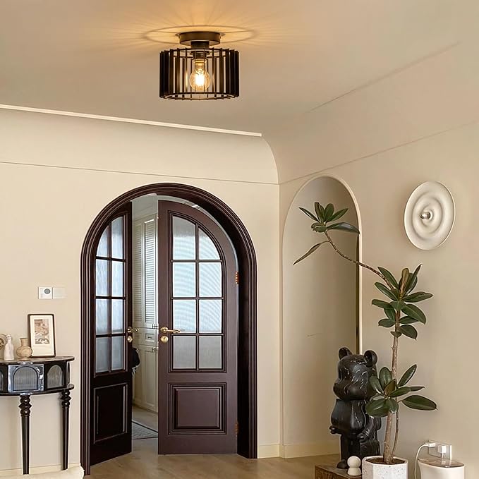 - Unique Design: Features a black iron cage structure, presenting an edgy industrial look that adds a touch of character to any space. This flush mount ceiling light is the perfect choice for hallways Eentryway Bathroom Bedroom Kitchen .