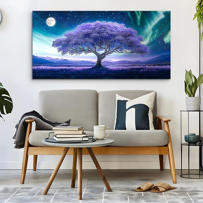 crmotu Tree of Life Large Wall Art for Living Room, Purple Tree Art Prints, Aurora Landscape Canvas Painting, Surreal Art Wall Pictures for Bedroom Bathroom, Modern Office Decor Artwork 24X48in