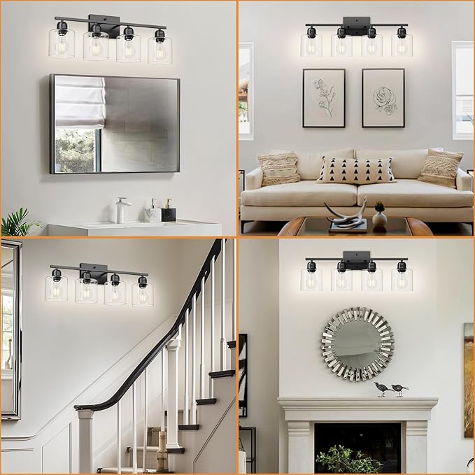 Black Vanity Lights for Bathroom 4 Light, Black Bathroom Light with Clear Glass, Wall Lights for Mirror Living Room Bedroom Hallway E26 Base