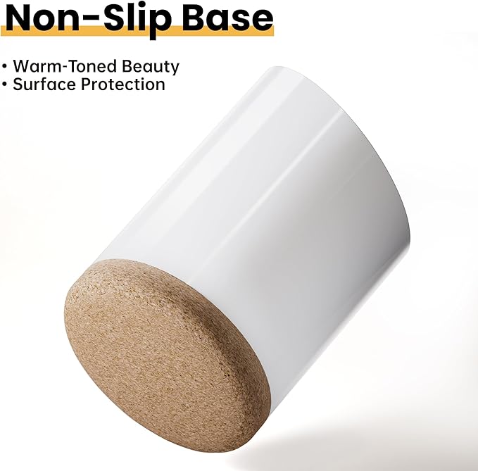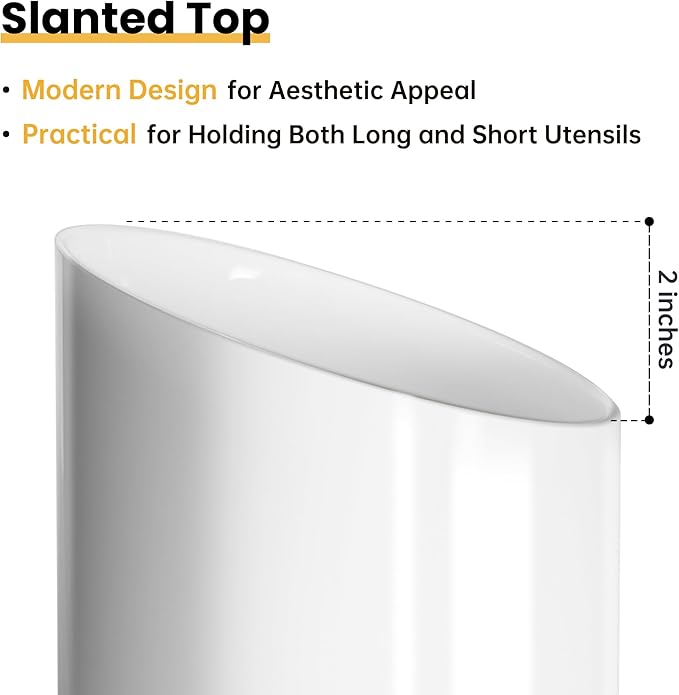 - 【Elegant Ceramic Design】: This utensil holder features a sleek white ceramic body with a modern slanted top and a natural cork mat, adding a touch of sophistication to any kitchen decor.