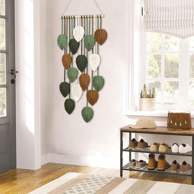 - 【Chic Wall Art】Its vintage macrame leaves design and boho vibe make it can fit in any interior. Simple and elegant tassel tapestry with beautiful leaf knit patterns, long leaves tassel and 4 harmonious colors, suitable for various decoration styles. This boho aesthetic wall hanging macrame will fill a blank wall, adding texture and comfort to your house.