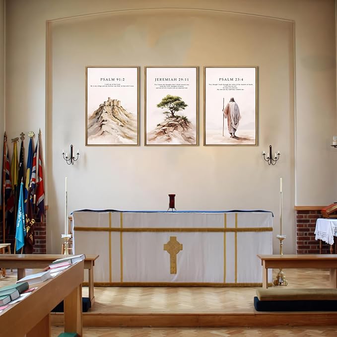 - 【Large Christian Wall Art】Enhance your home with this Christian scripture wall art set, use the bible verses of Psalm 91:2, Psalm 23:4 and Jeremiah 29:11 to remind us of faith, protection and god's guidance. This painting is designed in a minimalist and elegant watercolor style. This framed canvas art brings warmth and inspiration to any space, making it an ideal choice for your living room, bedroom, corridor or church.
