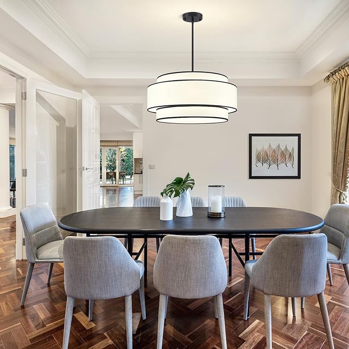 - ✅3-TIERS DRUM SHADE CHANDELIER DESIGN--Crafted with 3-layers of circular fabric lampshades and a robust, rust - resistant black metal frame, this modern dining room chandelier(ideal for placement above dining tables) not only boosts visual attraction but also scatters light evenly. As light filters through the fabric lampshade, it casts a soft, glowing radiance, fostering a warm and inviting atmosphere that fabric pendant light adds a touch of natural texture to your dining area’s decor.