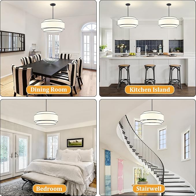 - ✅NO ASSEMBLY REQUIRED & ADJUSTABLE HEIGHT--This black chandeliers for dining room is simple to install and can be quickly mounted on standard ceilings.The drum chandelier included hardware and clear instructions make the installation process straightforward--just secure the lamp holder and lampshade together, then attach the fixture to your home’s circuit and install the bulbs to enjoy your perfect chandelier.Our modern farmhouse chandelier unlike chain hung alternatives,it uses connecting rods for improved stability and less sway.Drum bedroom chandelier equipped with 4 detachable rods,lets you adjust the hanging height to suit your space’s needs.