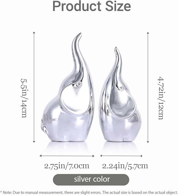 - [Symbol of Love and Loyalty] These silver ceramic elephant figurines beautifully symbolize love, loyalty, and good fortune. Designed as a couple with trunks raised high, these elephants convey a timeless story of unity and prosperity. Crafted in a minimalist style, the smooth ceramic finish adds a modern elegance, making them perfect for elephant decor for home or elephant sculptures for home decor. Their compact sizes—5.5 inches (14 cm) and 4.72 inches (12 cm)—make them an ideal fit for shelves, desks, or bedside tables.