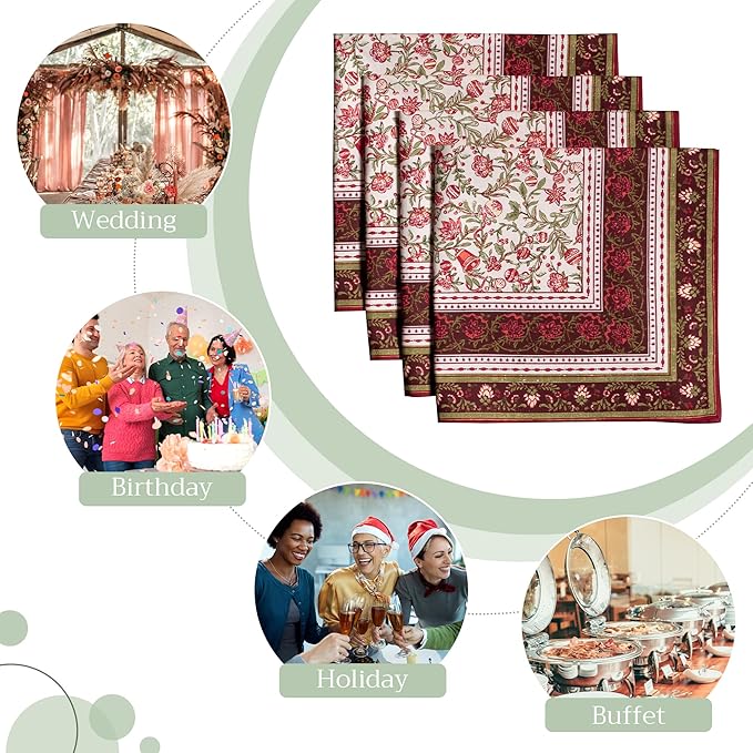 - Package Includes: Set of 4 cloth napkins, each 20"x20" in size. These soft square napkins add a cozy charm to any table setting. Perfect for everyday or special occasions. Crafted from 100% cotton, our products are Designed in Europe and Made in India.