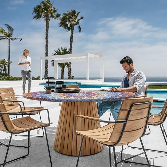Fitted Round Tablecloth Small Bohemian Vinyl Patio Table Cloths for 45-54" Tables Travel Vacation Camper Accessories Living Room New HomeHouse Decorations Outdoor Road Trip Must Haves