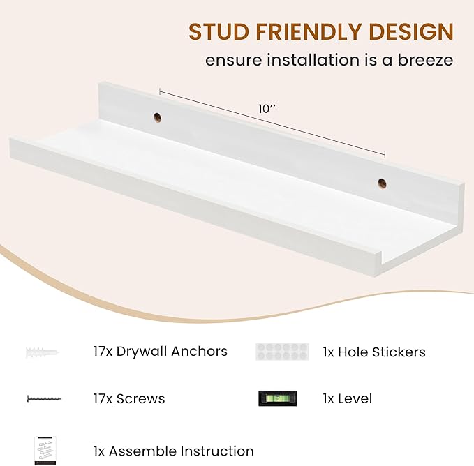 - Effortless Installation: You will get a level, screws for the wall, drywall anchors, a installation guide, and six picture shelves. Just follow the simple instructions and install in 10 minutes. We add additional screw and anchor to the hardware bag just in case