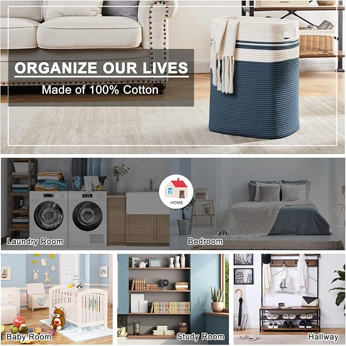 OIAHOMY Laundry Hamper-Laundry Basket,Tall Cotton Storage Basket with Handles,Decorative Blanket Baskets for Living room,Collapsible Large Baskets for Toys,Pillows,Clothes-16x13x22in-Blue