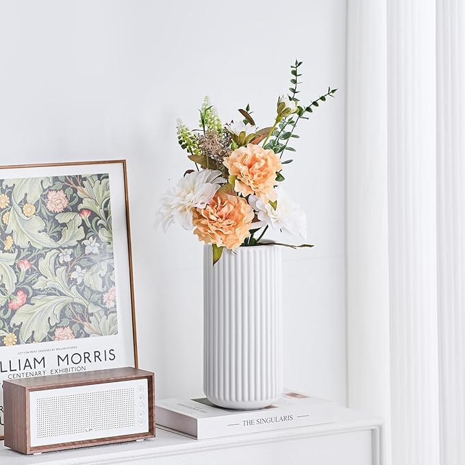 White Ceramic Flower Vase for Pampas Grass, 10 inch Large Decorative Centerpiece Ribbed Vase for Dining Table, Office Desktop, Shelf Bookshelf, Mantel, Entryway, Bathroom, Countertop, Farmhouse, Gift