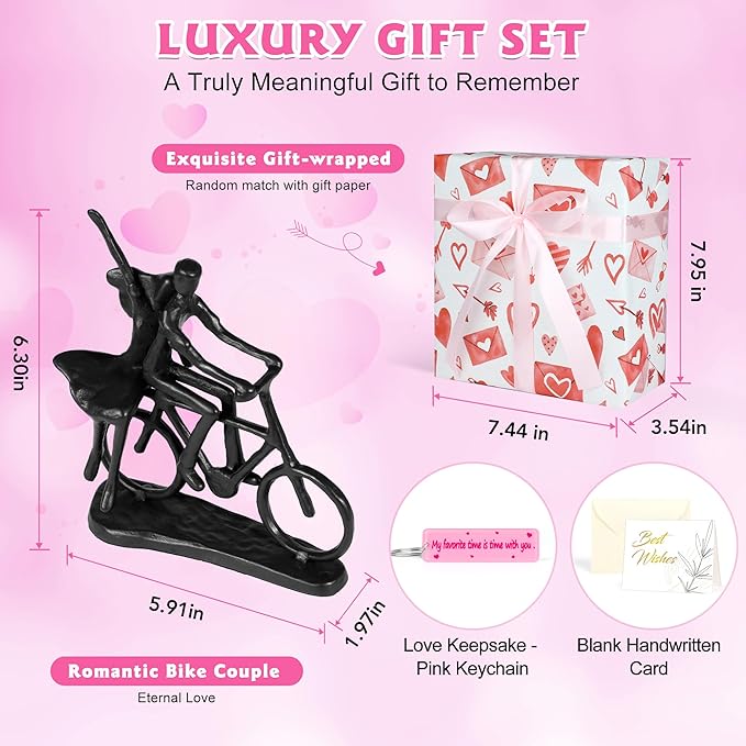 - ETERNAL COUPLE IRON SCULPTURE: Our aesthetic sculpture portrays a loving couple is riding a bike around the streets, romantic breath pervasive everywhere, like a pleasant and lively melody, sublimate the graceful movement of love. Its timeless and eye-catching design evokes love and companionship between man and woman, which is a poignant display of love and romance. The cute size of it is 5.91 x 1.97 x 6.30 inches, a romantic focal point anywhere