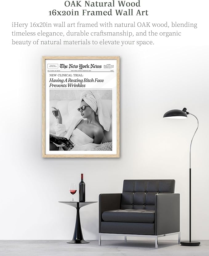 iHery Having A Resting Bitch Face Prevents Wrinkles Newspaper Framed Wall Art, Natural OAK Wood Trendy Large 16x20 in Vintage Canvas Wall Art Decor For Bedroom Living Room Bathroom Set of 1