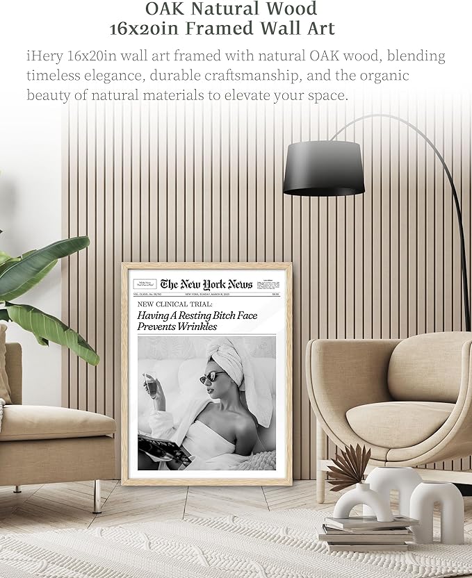 - Playful "Resting Bitch Face Prevents Wrinkles" Artwork: This bold framed wall art features the humorous headline, "Having A Resting Bitch Face Prevents Wrinkles," presented in a trendy vintage newspaper style. It’s the perfect quirky addition to your bedroom, bathroom, or living room décor, adding personality and a touch of humor to your space.