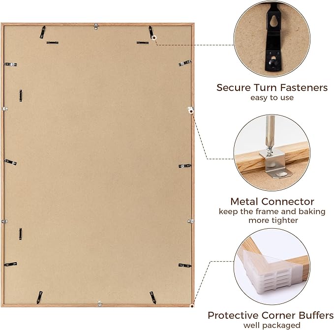 - SLEEK & MINIMALIST HOME DECOR - The neutral oak finish of this wood picture frame set brings out all of the color in your poster, drawing attention to it like never before, you can display your artwork in the most sophisticated way possible with. The excellent craftsmanship and neutral color make it a classic addition to any room - or office! Also a great gift for birthdays, anniversaries, housewarmings, Christmas, Thanksgiving, Hanukkah, and just about any occasion