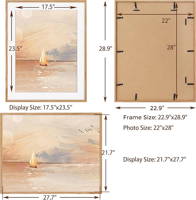 - NATURAL SOLID OAK WOOD FRAME - This 22x28picture frame is made of high-quality 100% solid oak wood, the natural wood grains on this real oak wood picture frame lends it an authentic look. This poster frame comes with 1.2mm ivory mat for visualization purposes, and 22x28 picture frame can be matted to 18x24.