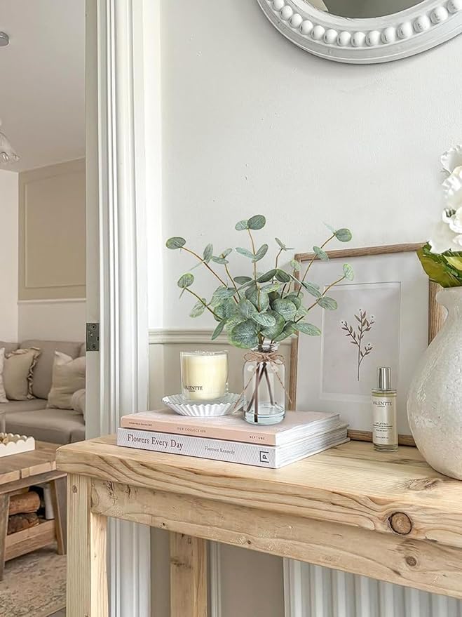 - Ideal Size: Artificial eucalyptus plant stems stand at 13.5 inches tall, paired with a glass vase measuring approximately 5.1×2.55×2.55 inches, making it suitable for any small corner of your home. Whether by the fireplace, on a bookshelf, or by the windowsill, it seamlessly integrates, adding a touch of natural greenery to various spaces.
