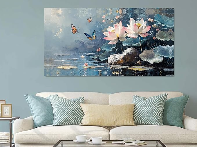 Ardemy Lotus Wall Art for Living Room Butterfly Large Canvas Art Wall Decor Textured Pictures Artwork Bedroom Kitchen Dining Home Office, Large 48"x24"