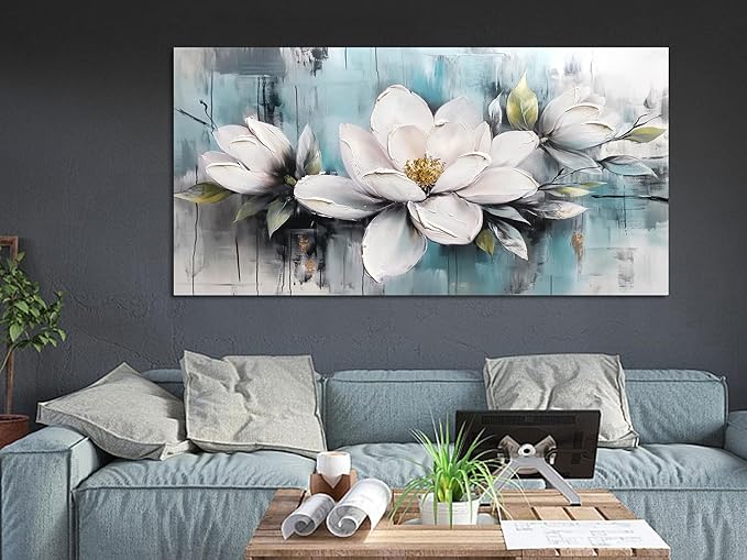 Ardemy Flower Wall Art for Living Room White Floral Canvas Bedroom Painting Magnolia Wildflower Picture Teal Grey Artwork Framed Bathroom Home Office Dining Room Wall Decor, Large 40"x20"