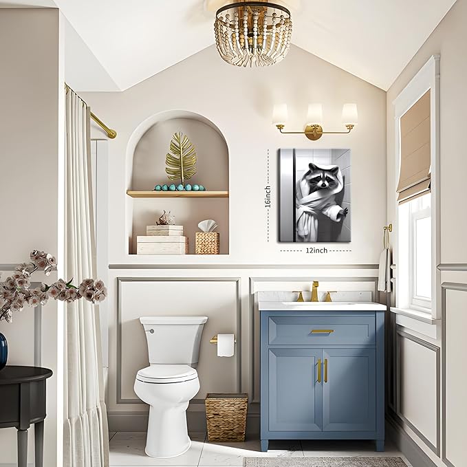 - Versatile Decor: Not only is this black and white raccoon art perfect for the bathroom, it's also perfect for your living room, office, or any other space that could use a fun decor. Let the charming raccoon in a bathrobe add personality to your home