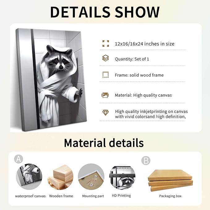 - Humor Home Decor: Add some fun and whimsy to your space with our framed canvas wall art featuring a raccoon wrapped in a white bathrobe. The playful design is sure to bring a smile to anyone who sees it, making it the perfect addition to any bathroom, living room, or bedroom