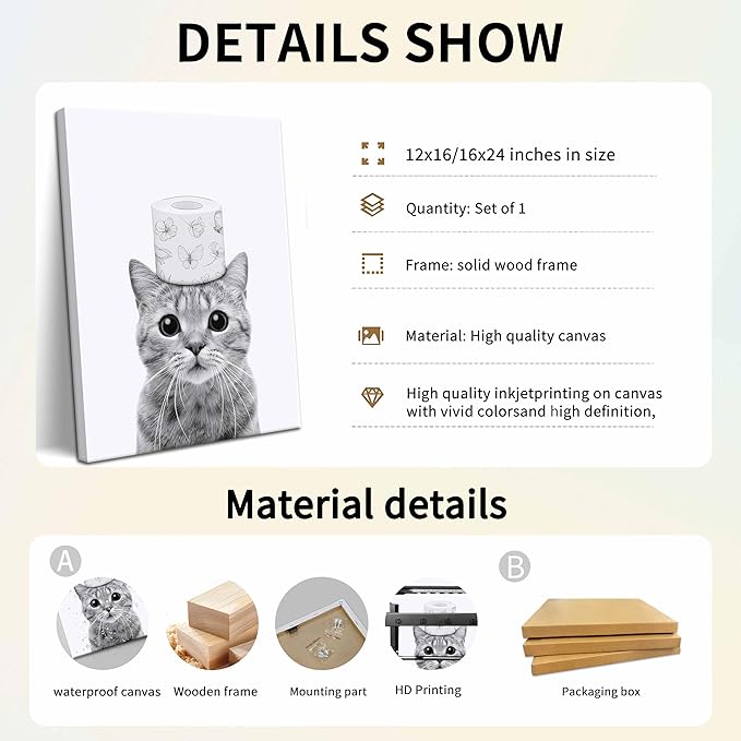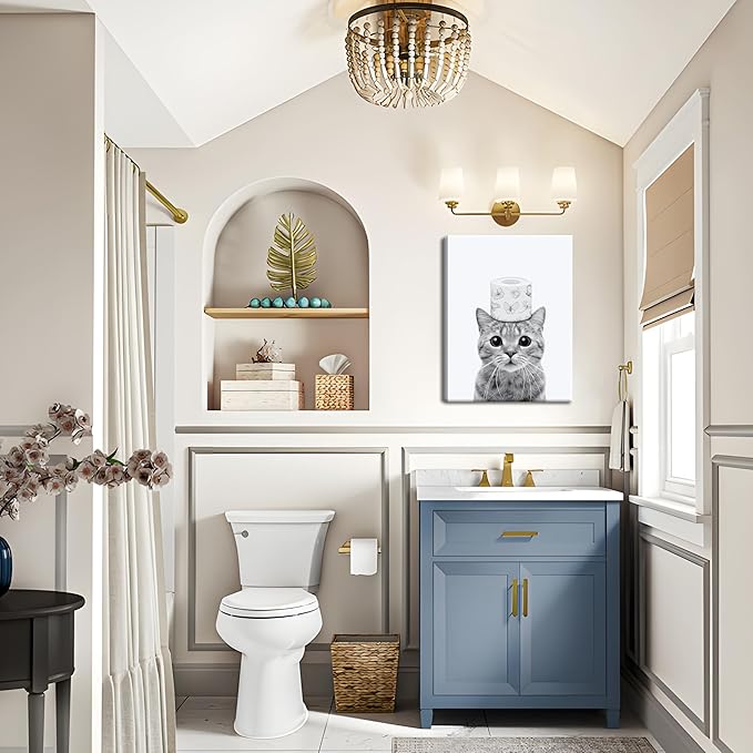 - Black and White Bathroom Wall Art: With its black and white hues and vintage appeal, this 16x24-inch piece will complement a variety of decor styles, from modern to rustic. The adorable cat with the unique toilet paper roll adds a touch of quirkiness, creating a delightful focal point and enhancing the charm of any bathroom or living space