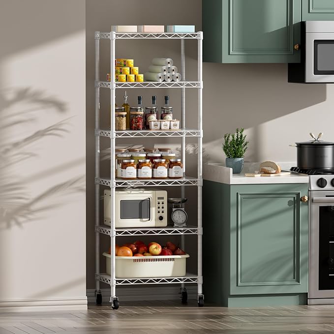 SINGAYE 6 Shelves Storage Shelf Wire Closet Bathroom Organizers Metal Pantry Kitchen Small Garage Shelving Unit Laundry Room Organization Home Narrow Rack Net Basket with Wheels White