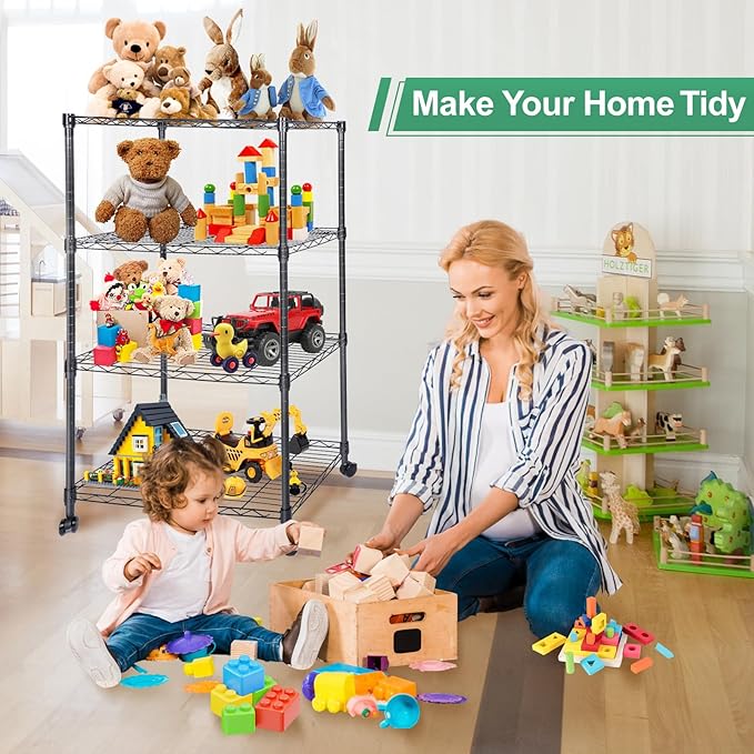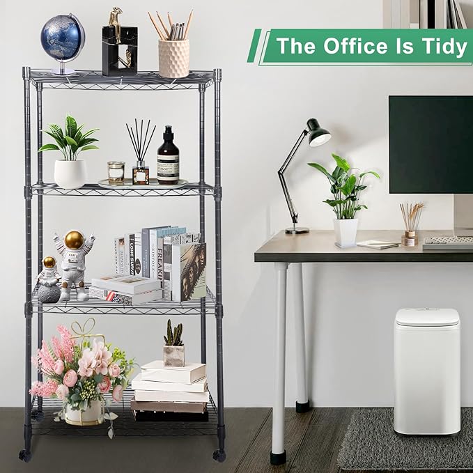 - High Weight Capacity: Constructed from sturdy metal materials, Wire Shelvingboasts excellent durability, Each shelf has a capacity of up to 400 lbs, with a maximum weight capacity of 1600 lbs total, capable of supporting weightover extended periods, ensuring your items are safely and neatly stored.