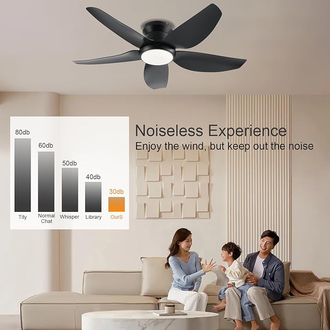 Ceiling Fans with Lights, 43 Inch Low Profile Ceiling Fan with Light and Remote/App Control, Flush Mount, Reversible DC Motor, 3CCT, Dimmable, Noiseless, Black Ceiling Fan for Indoor/Outdoor Use