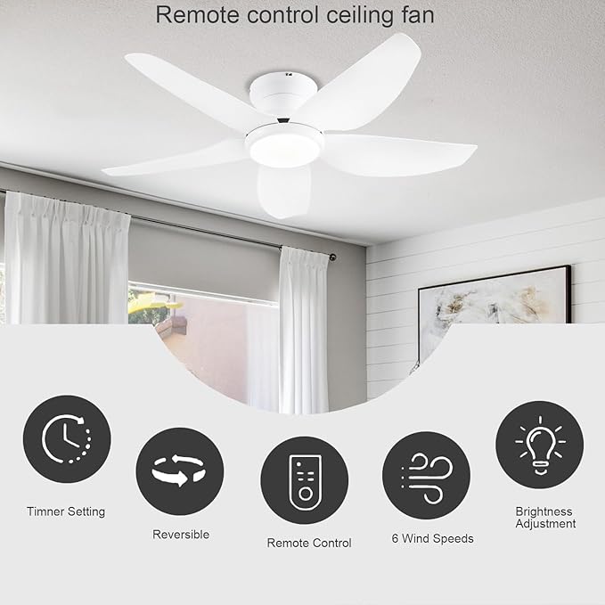 Ceiling Fans with Lights, 43 Inch Low Profile Ceiling Fan with Light and Remote/App Control, Flush Mount, Reversible DC Motor, 3CCT, Dimmable, Noiseless, White Ceiling Fan for Indoor/Outdoor Use