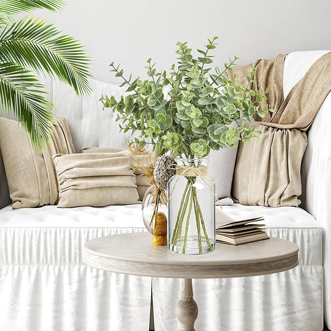 - 【Premium Material】Made from high quality plastic, our eucalyptus stems are odourless, safe and non-toxic. Artificial eucalyptus mimics the look, feel and texture of real eucalyptus leaves with vibrant colours that won't fade. The vase is made from high quality glass, clear and transparent for an exquisite look. Durable and can be used for a long time