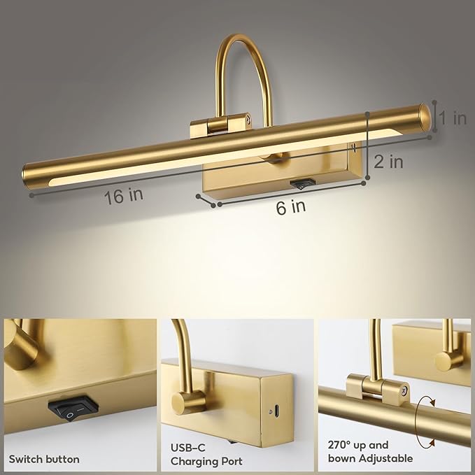 - Battery Operated Picture Light: This 15.75 inch picture light features a built-in 5000mAh rechargeable battery and includes a USB-C charging cable. Eliminating the need for hard wiring, this gold wireless art light is entirely battery-powered. A single charge provides extended use, lasting up to 30 hours at its lowest brightness setting.