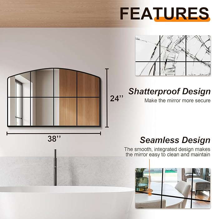 Wall Mirror, Full Length Floor, Window Pane for Living Room Decor, Decorative Wall Art, Large Wall for Bedroom, Hallway, Living Room Arch-38"X24"