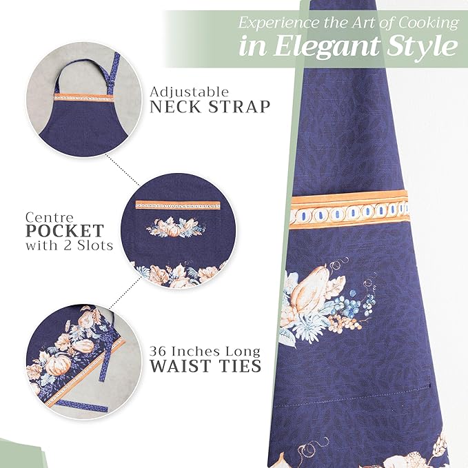 - PACKAGE INCLUDES: It includes 1 Apron with the long waist ties and an adjustable neck strap. Our kitchen apron has pockets in the centre which can give you enough place to hold grill slips, recipe, phone etc. Made from 100% cotton, each apron in this collection is just as elegant and charming it can be and brings out the spirit of the warm season in an artsy way. Our products are Designed in Europe and Made in India each product in our collection is a simple delight.