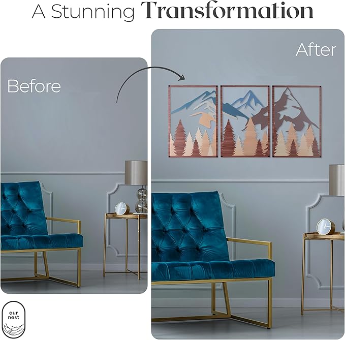 - Dynamic 3D Shadow Effect – Designed with a cut-out silhouette, this abstract mountain wall art casts beautiful 3D shadows, bringing nature to life. Included spacers add depth and make installation simple, creating a bold and dimensional focal point.