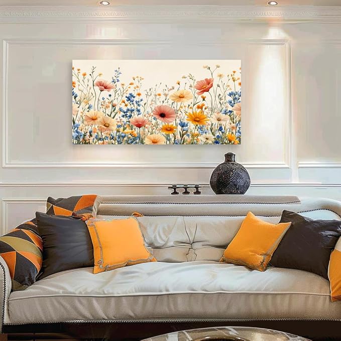 - 【FLORAL ARTWORK】: Beautiful wildflower meadow canvas print featuring pink poppies, blue delphiniums, yellow daisies, and delicate white blooms