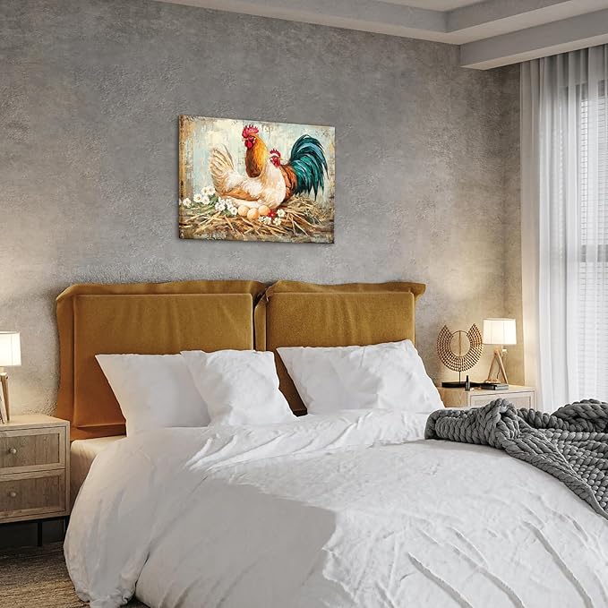 KREATIVE ARTS Farmhouse Chicken Picture Canvas Wall Art for Kitchen Dining Room Rustic Rooster with Fresh Eggs Framed 24x32 Inch Hen and Hatching Chicks Painting Ready to Hang