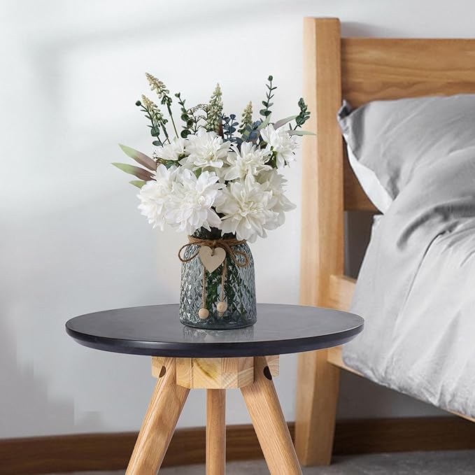 - LEFTOVER's Faux Flowers for Vase:Silk artificial flowers Bouquet in Vase include 8 dahlia heads(including 5 big and 3 small) eucalyptus stems and some fake plants , and a black glass vase with a heart, ball pendant and twine,perfect for coffee table centerpiece and dining table centerpiece decor