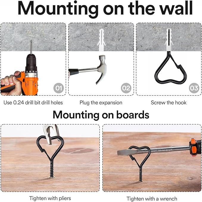 - Quick and Easy Installation:The hooks can be installed in just a few steps. Simply hammer or screw them into wood surfaces using the included wing nut driver. For harder walls, pre-drill the holes and use the provided expansion tubes for a stable hold