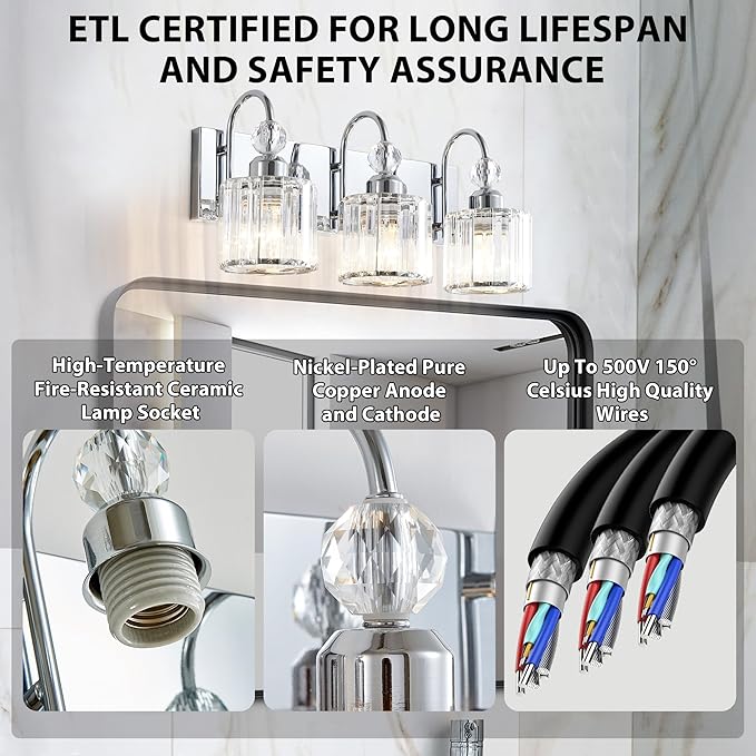 - ETL certified: Our Crystal Bathroom Light Fixtures are ETL certified, ensuring a long lifespan and reliable performance. They feature a high-temperature, fire-resistant ceramic lamp socket, and high-quality wires rated up to 500V and 150°Celsius. Enjoy bright and safe lighting with confidence.
