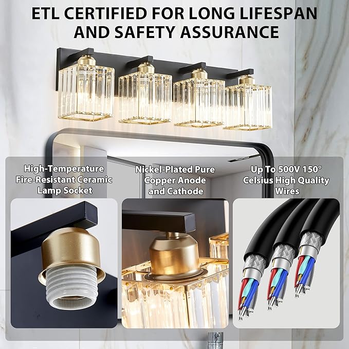 - ETL certified: Our Crystal Bathroom Light Fixtures are ETL certified, ensuring a long lifespan and reliable performance. They feature a high-temperature, fire-resistant ceramic lamp socket, and high-quality wires rated up to 500V and 150°Celsius. Enjoy bright and safe lighting with confidence.