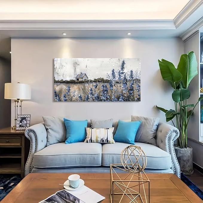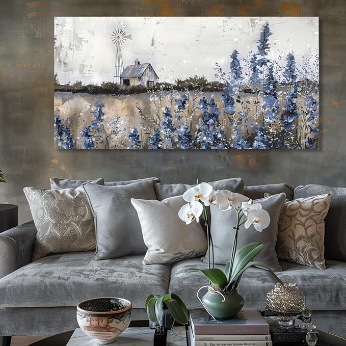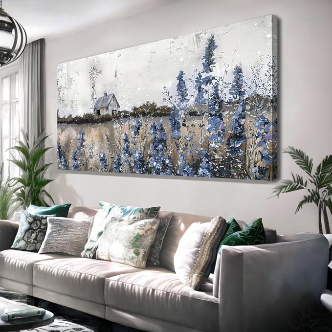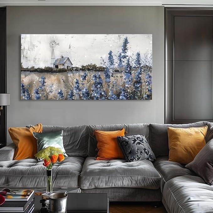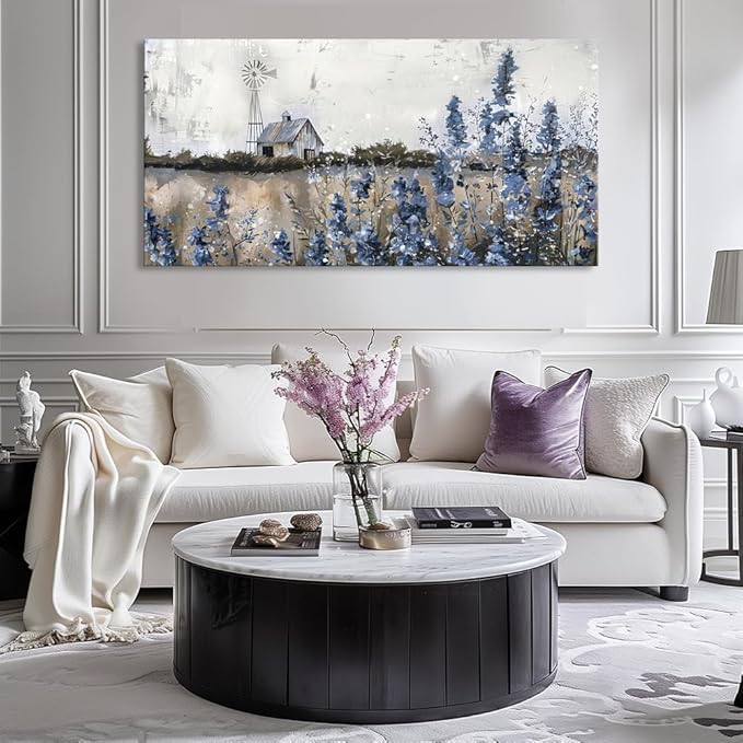 Wall Art Vintage Farmhouse Canvas Print Retro Countryside Flower Field Nature Meadow Landscape Rustic Windmill Barn Picture Framed Artwork for Home Bedroom Living Room Black Purple 48x24in