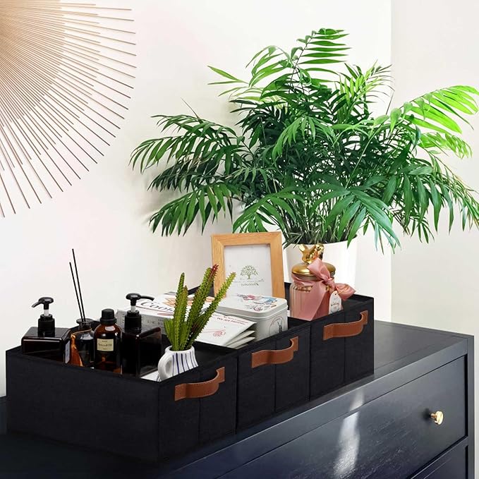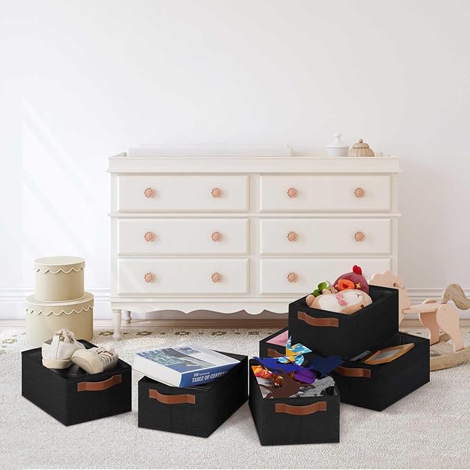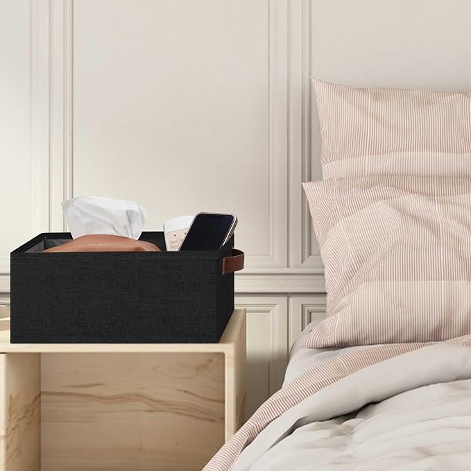 GhvyenntteS Small Fabric Storage Bins 12 Pack, 11.8" x 7.87" x 5.11" Storage Basket with Leather Handles, Closet Storage Bins for Shelves, Storage Baskets for Shelves, DVD Storage (Black)