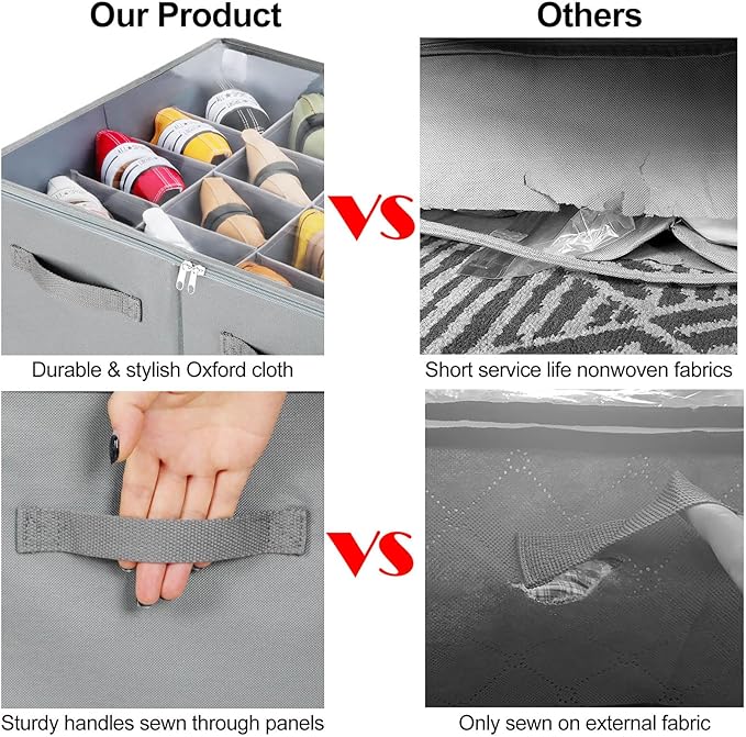 - Durable Materials & High-Quality: High quality Oxford fabric is more durable and stylish compared to non-woven fabrics. The reinforced side boards and inserted bottom ensure that shoe box can maintain its shape even under pulling or other pressure, and will not collapse when empty or full. The reinforced handles allow you to easily remove shoe bin from closet, shelves ect. With no handles on the back to avoid occupying space when placed against the cabinet wall