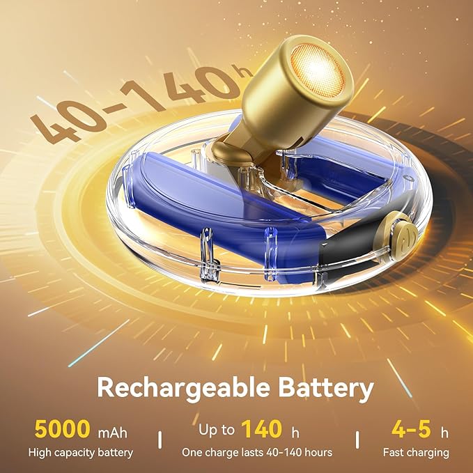 - EXCELLENT BATTERY LIFE & BRIGHTNESS: No need to worry about the power running out quickly. The equipped updated 5000mAh rechargeable built-in battery lets you keep the light on for up to 40 hours at the highest brightness, 140 hours at the lowest brightness, 4-5 hours to fully charge. The standby time is about 6 months. Maximum brightness of the up light is 80 Lumen, with 3000K warm glow. Bright and soft lighting brings you a warm and pleasant atmosphere.