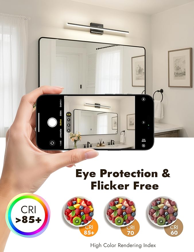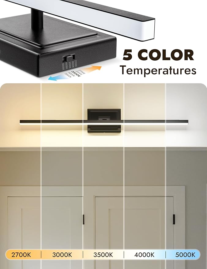 - 【5 CCT & Modern Design】This bathroom lighting fixtures over mirror offers five adjustable color temperatures(2700K/3000K/3500K/4000K/5000K), allowing you to choose the perfect lighting for any situation. The sleek, modern design of these bathroom lights complements any decor, adding a touch of elegance and functionality